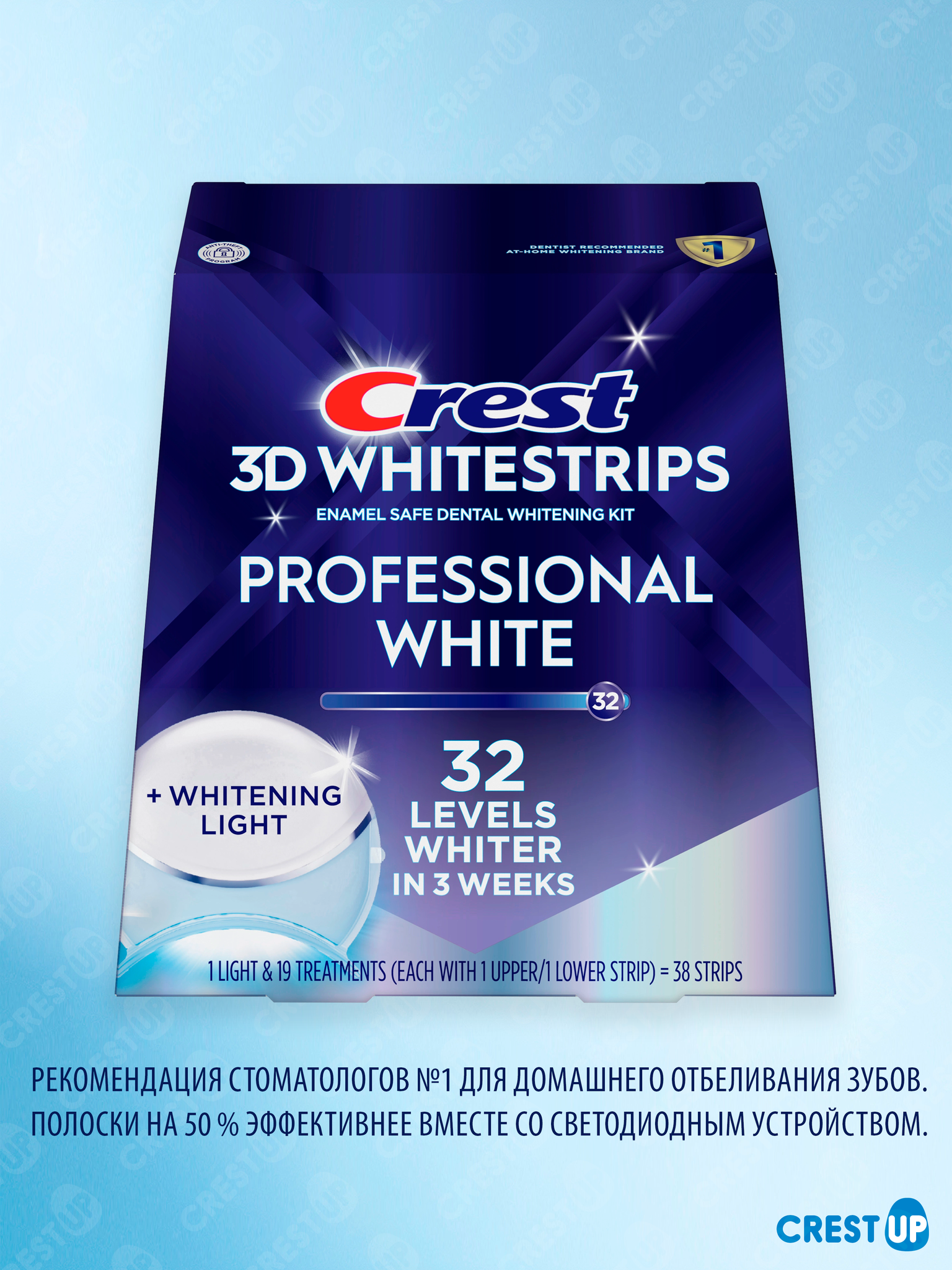«Crest 3D Whitestrips Professional White Light» - Эффект отбеливания зубов до 9 тонов, а уровень отбеливания 32.