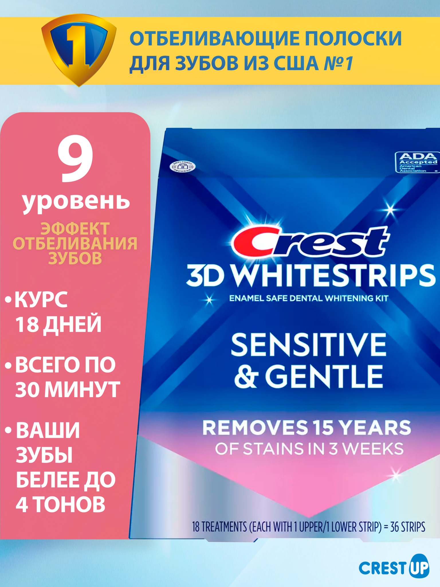 «Crest 3D Whitestrips Sensitive And Gentle» – Эффект отбеливания зубов до 4 тонов, а уровень отбеливания 9.